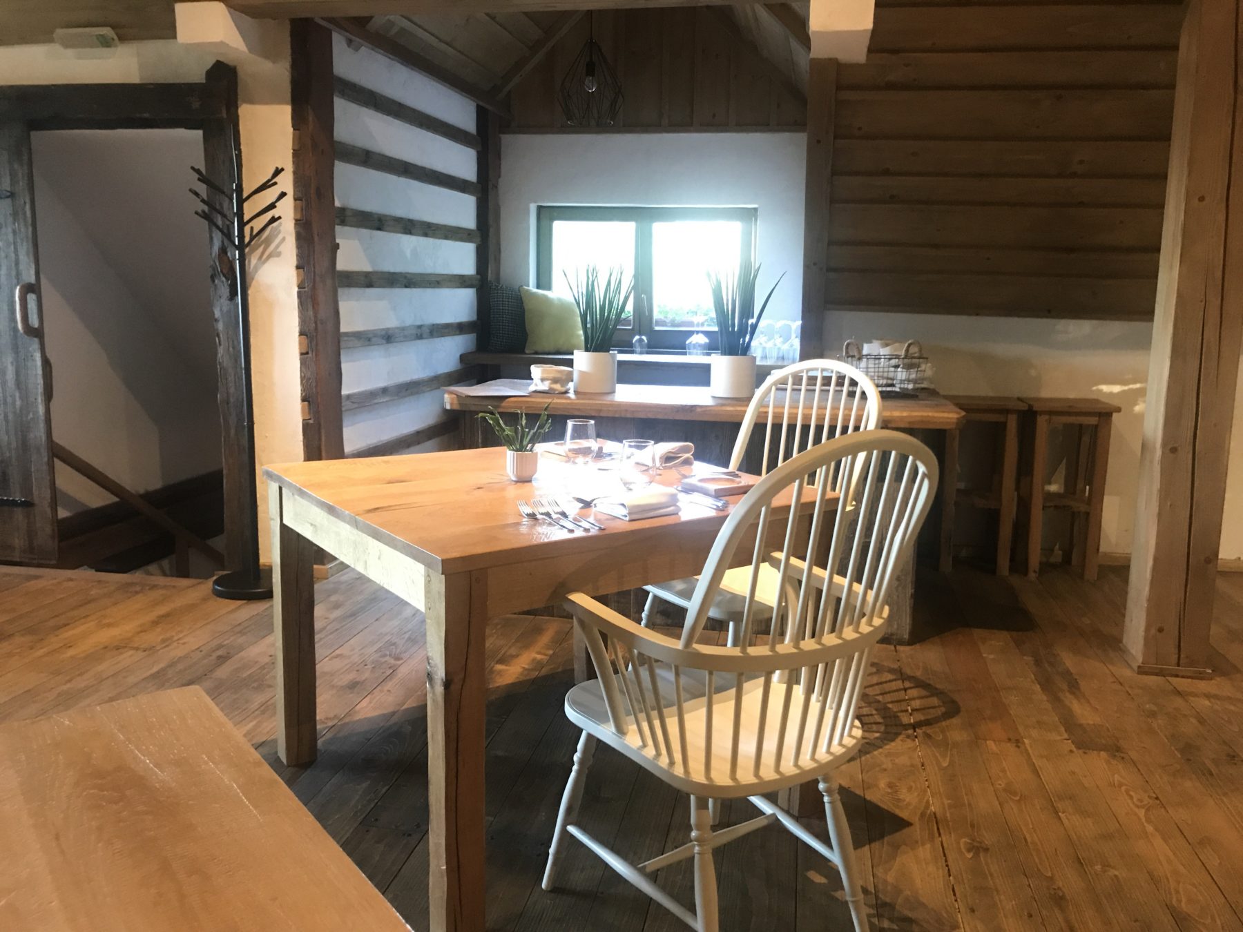 Večerjo sva si rezervirala ravno na prvi dan odprtja restavracije, 7.septembra, ki je bila v avgustu zaprta zaradi gradbenih del. Večerjala sva v zgornjem, novem delu nadstropja brunarice, čigar notranjost naju je tako spominjala na restavracijo Faviken, da sva si skoraj predstavljala Magnusa Nilssna in Luko Koširja skupaj ustvarjati jedi.