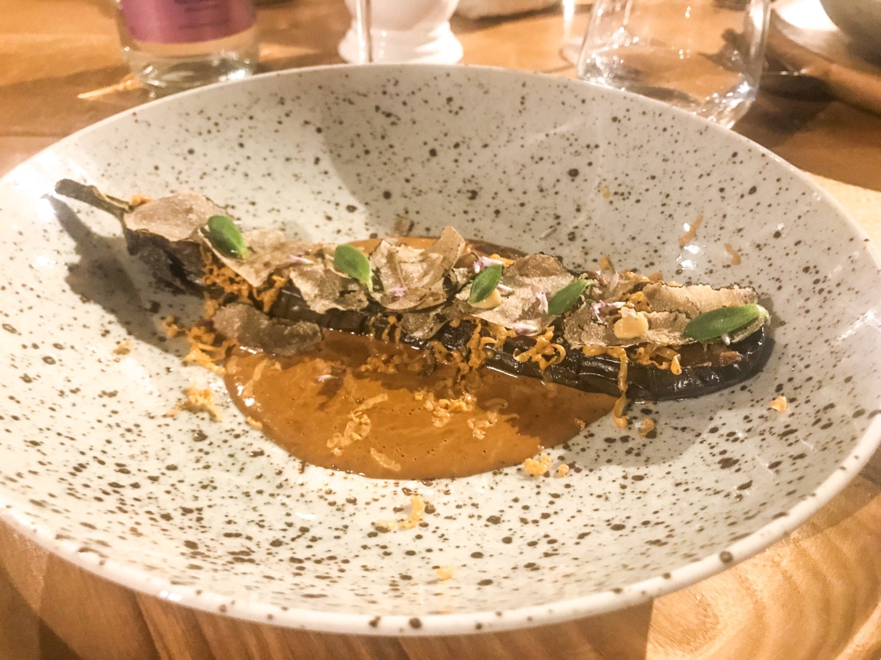 Naslednja krožnika sta bila več kot odraz mojstrstva. Moj krožnik je bil povsem azijsko-slovenski: poširano jajce, hokaido buča, ocvirki in lisičke; Suzana pa je jedla raviole polnjene s kvarnerskimi kozicami. Potem pa je prišel krožnik, po katerem se nama je kar zavrtelo od okusov: jajčevec, lešnikov miso, črni tartuf in sir karamelizirane sirotke.