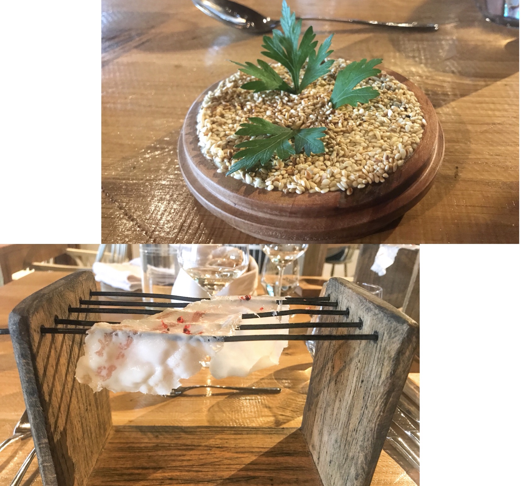 Pozdrav iz kuhinje je bil postrežen v majhnem lesenem krožniku: humus iz čičerike s sezamovimi semeni. Sledil je špeh krškopoljca na posebnem lesenem stojalu. Nazdravila sva s penino Bjana.