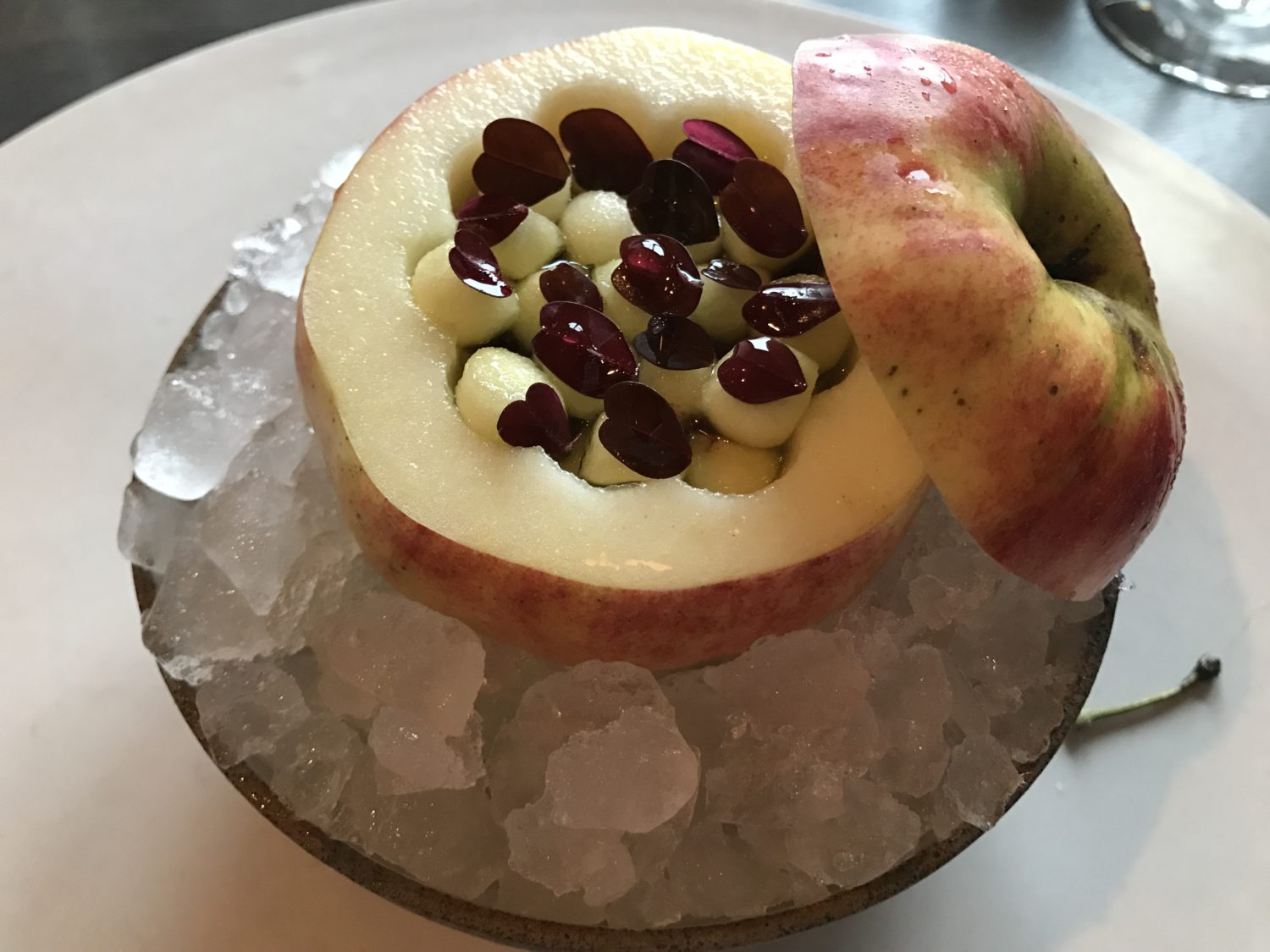Med najbolj zanimivimi je bilo jabolko, postavljeno na ledu, znotraj izrezljano in napolnjeno z lepo oblikovanimi jabolčnimi kroglicami.