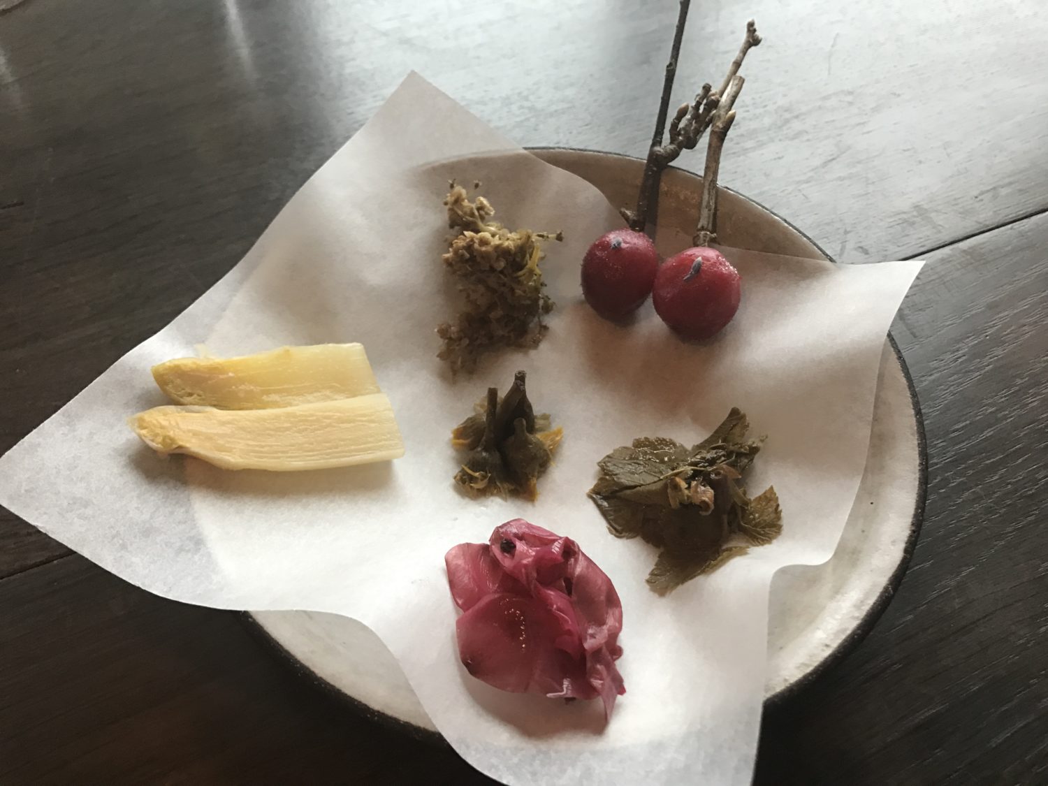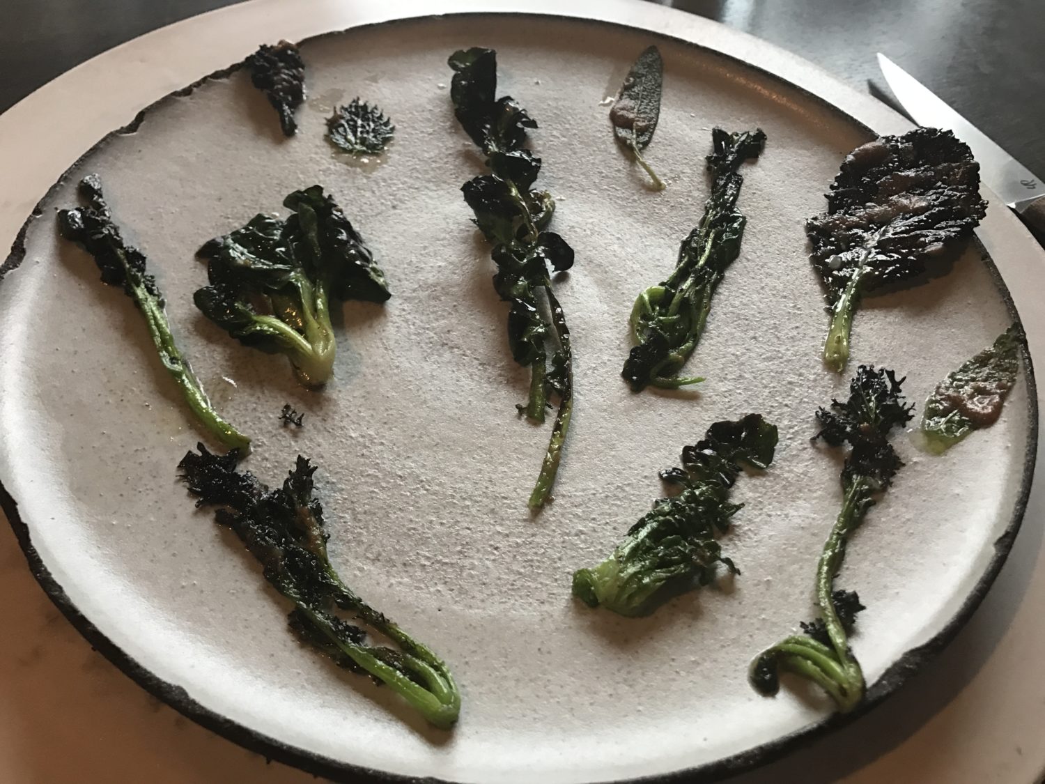 Jesenski krožnik z listi fermentiranega česna, v njem pa skriti majhni grižljajčki s hruško in krekerji z mravljami. Sledila so zame najbolj zanimive jedi od redkvine pite, ožganega travniškega zelenja z pokrovačevo kremo do glavne zvezde, pečene race, ki nama jo je na pladnju prinesel Rene osebno.