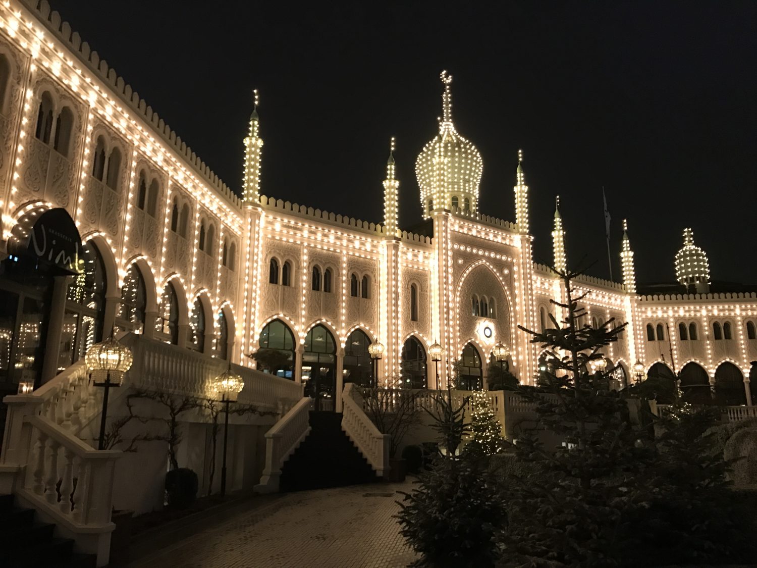 Po večerji sva se s taksijem odpravila do zabaviščnega parka Tivoli in se sprehodila po stezi, ki obkroža park. V parku je poskrbljeno za zabavo, od različnih vrst vrtiljakov, za bolj pogumnejše pa ne manjka tudi adrenalinska vožnja z vlakom smrti in prosti pad. V parku stoji eden najlepših objektov v mestu, v mavrskem slogu zgrajen hotel Nimb. Še posebno pa je lep ponoči, ko je osvetljen z številnimi lučkami.