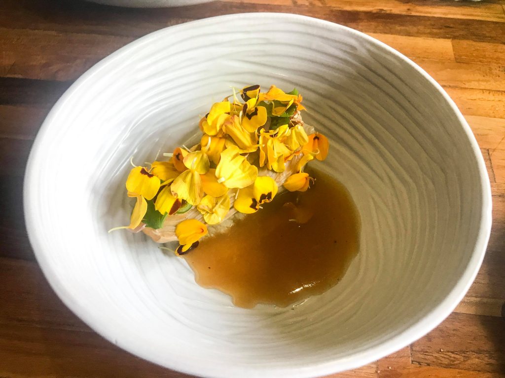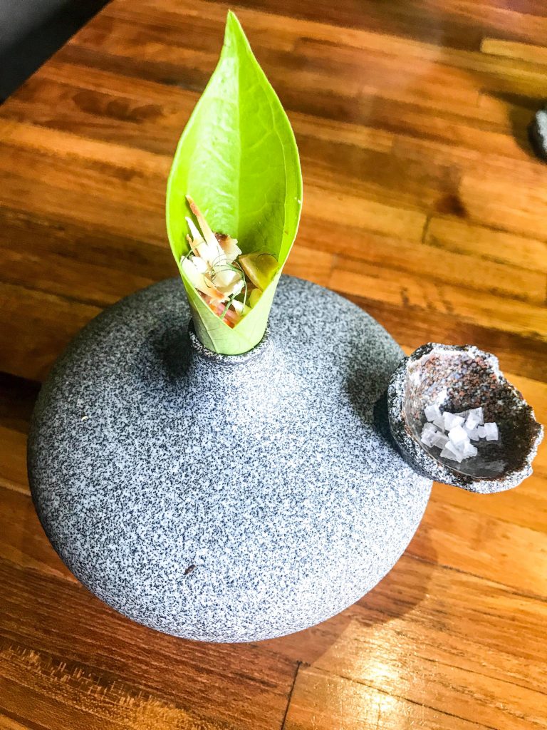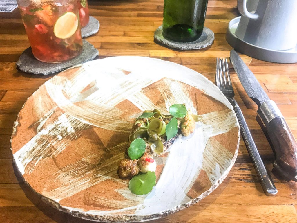 Nisva si zapisovala točno kaj je bilo vse na krožnikih in tudi ni najin namen, da dolgoveziva o vseh jedeh do potankosti saj nisva strokovno usposobljena in sva samo ljubitelja dobre hrane. Tukaj vam bova opisala nekaj hodov, ki sva si jih najbolj zapomnila. BANANA BLOSSOM je bil krožnik kreme iz praženih banan z emulzijo arašidovega olja, vloženo šalotko v limetinem soku, koriandrom in listi ognjiča.