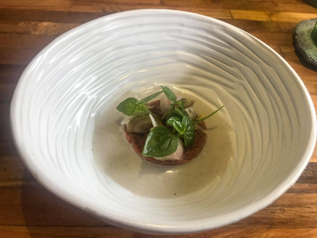 GOAT TARTARE je s kremo rahlo popečenega jajčevca na žaru, vloženim jajčevcem, fermentirano šalotko, na koncu pa vse skupaj zaokroži kokosovo mleko.