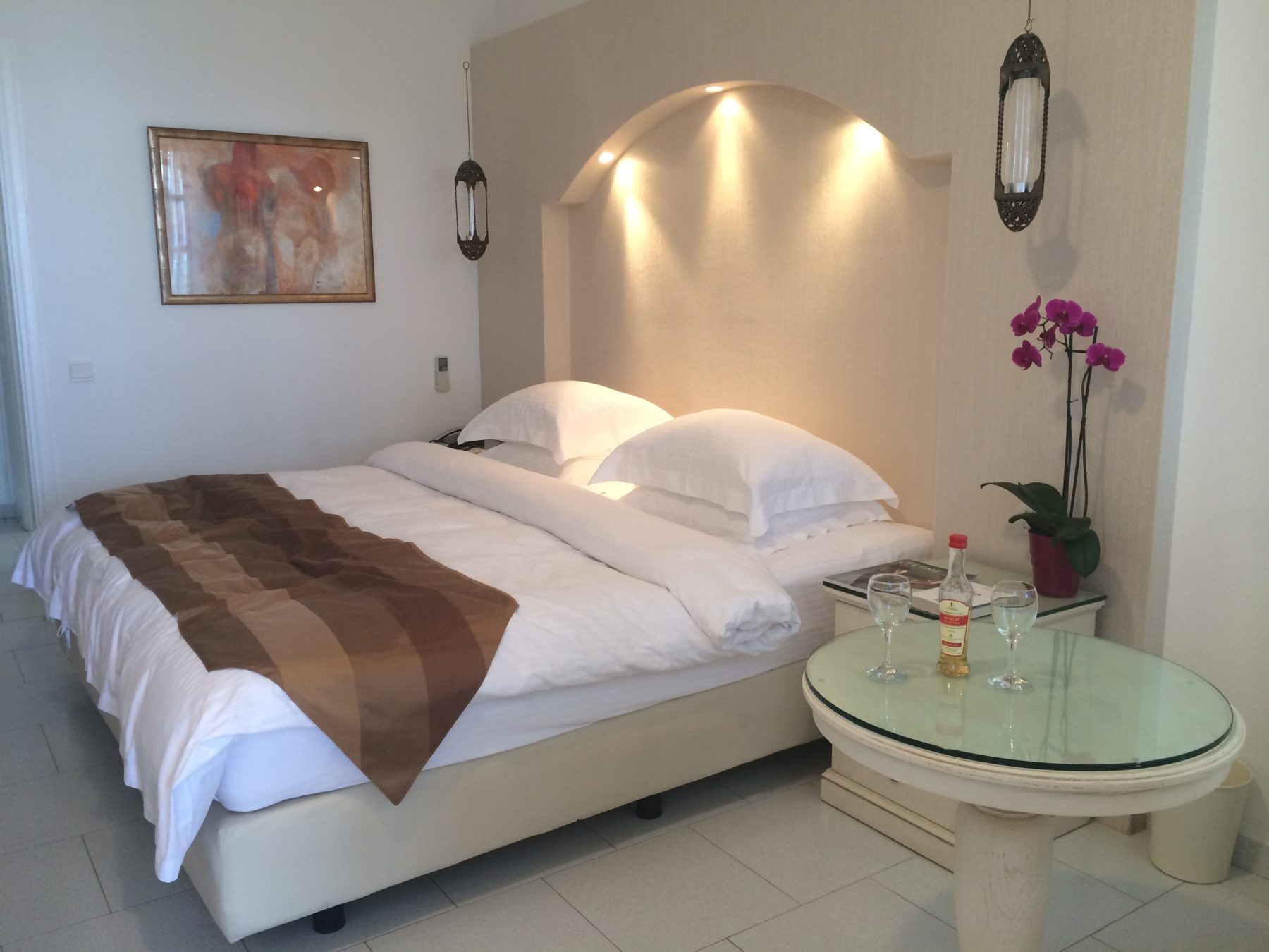 Midva sva letela iz Milana do Mykonosa, kjer sva preživela tri noči v krasnem hotelu Myconian Ambassador Relais & Chateaux Hotel. Leži na južnem delu otoka v kraju Platis Gialos z istoimensko plažo , ki je v tistem času ponujala še veliko praznih mest in kristalno čisto morje. Bivala sva v čudoviti beli prostorni sobi z jacuzijem in prelepim razgledom na zaliv. Da so ti dnevi zelo hitro minevali je pripomoglo vzdušje v hotelu in okrog njega.
