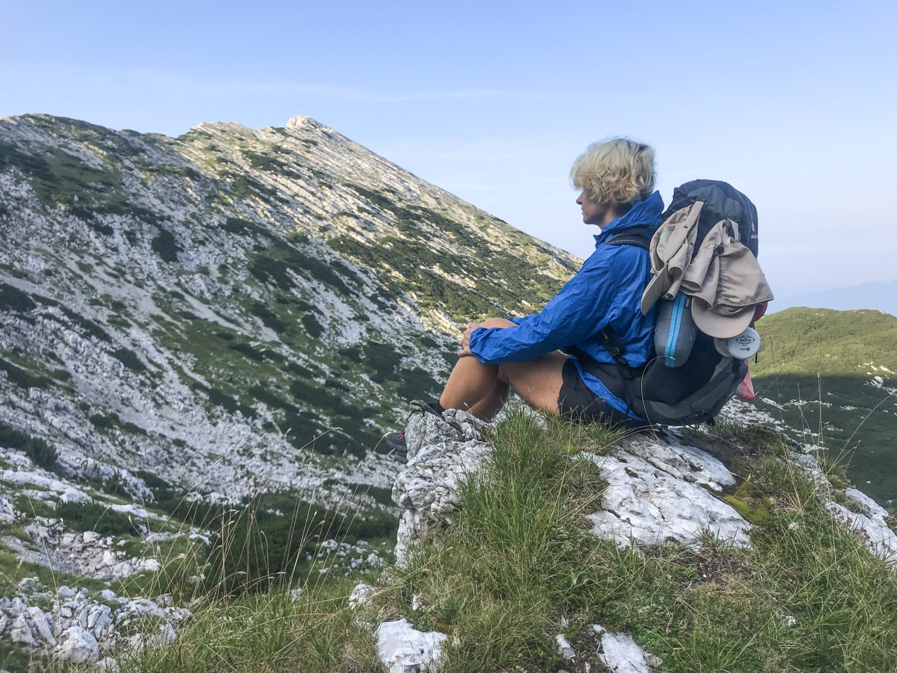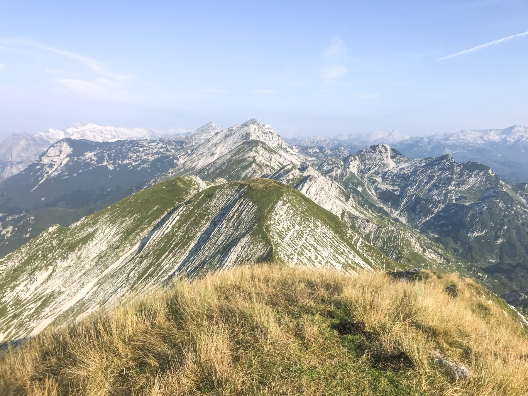 Osmi dan smo že v zgodnjem jutru močno zagrizli v hrib. Nad planino smo v daljavi slišali cingljanje krav in se po rušju počasi, a zanesljivo, vzpenjali do vrha prelaza. Na poti se nisva mogla načuditi, koliko planik je bilo ob njej in ko smo prispeli do vrha Vogla, se je Ana ravno prebudila v jutro s prelepim razgledom na Triglavski narodni park.