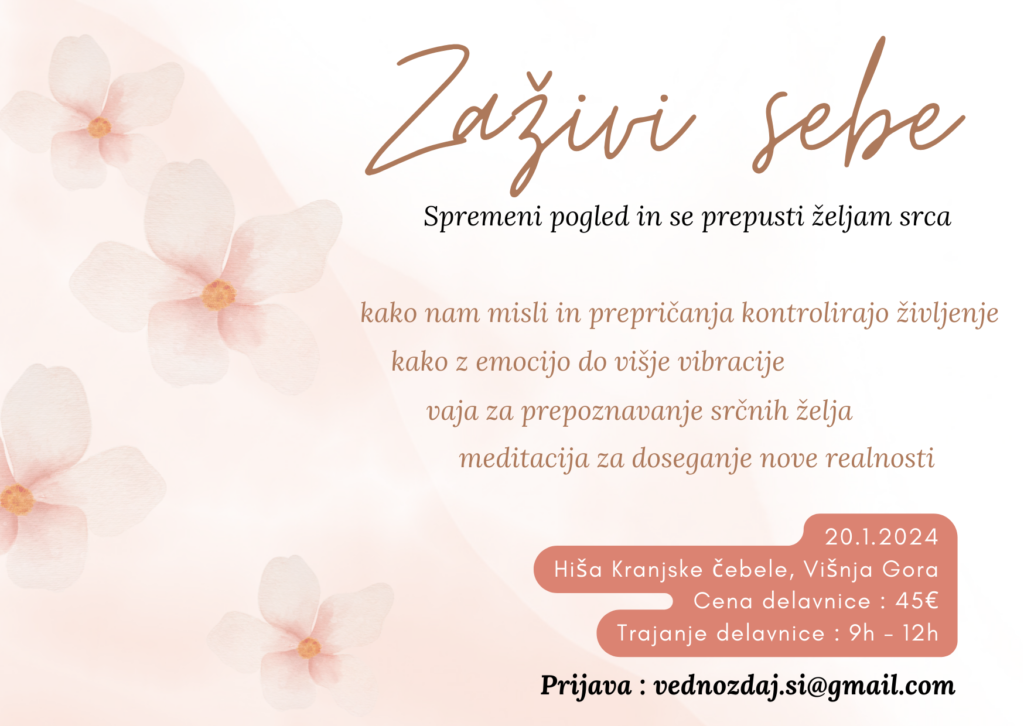 Kako zaživeti sebe se veliko pogovarjamo na najini delavnici ZAŽIVI SEBE. Kako so naše misli in prepričanja velik dejavnik pri kreiranju naše realnosti. Kaj je emocija in kako si z njo pomagamo do višje vibracije, da privlačimo k sebi želeno. Predvsem pa se osredotočamo na naše srčne želje, ki jih tekom življenja zanemarimo. Čas je, da se jim iskreno posvetimo. Meditacija nas na koncu popelje v čudovit zaključek delavnice in energijsko lepo zaključi naše druženje.